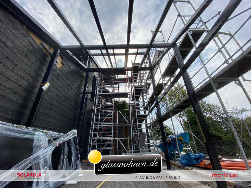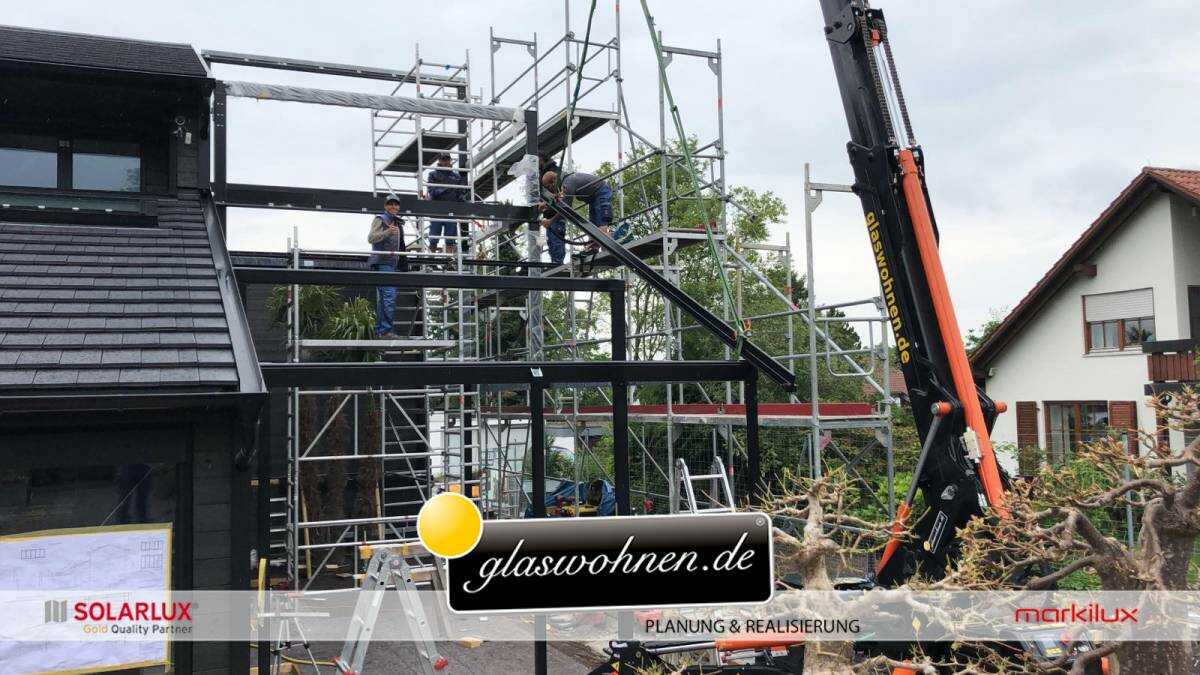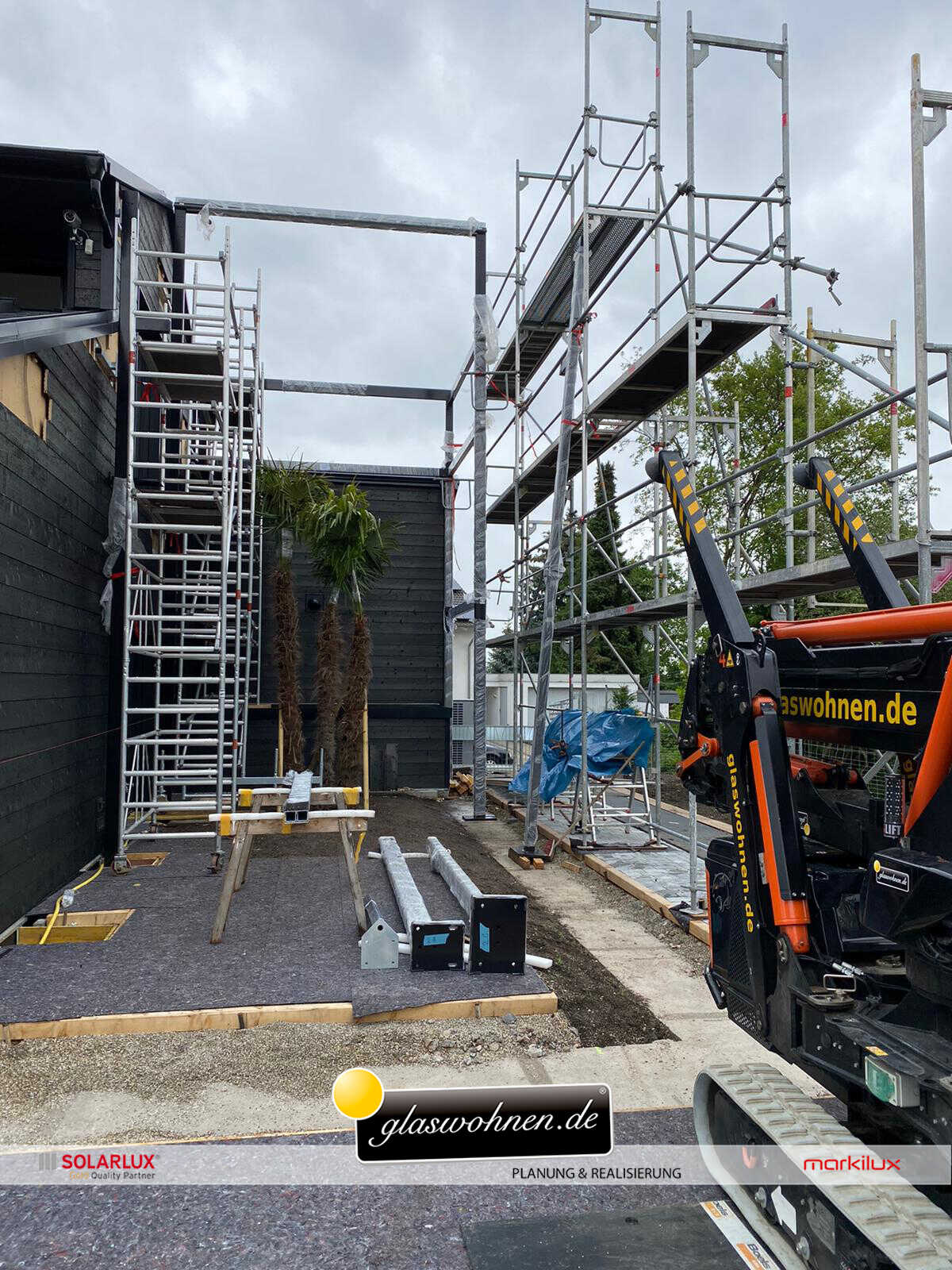 Die Baustelle ist eingerichtet, Gerüste stehen und unser Spinnenkran „Hildegart“ steht in den Startlöchern, um die Stahl- und Aluteile an Ihren Platz zu heben.